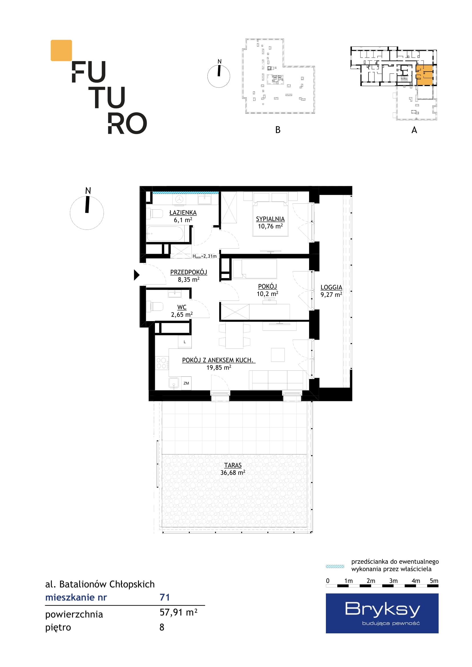 Nowoczesne mieszkanie o powierzchni 57,91 m² znajduje się na ósmym piętrze inwestycji przy al. Batalionów Chłopskich. Jego największym atutem jest imponujący taras o powierzchni 36,68 m², który stanowi wyjątkową przestrzeń do relaksu, spotkań i korzystania z prywatnej strefy na świeżym powietrzu. Dodatkowo mieszkanie posiada również loggię 9,27 m², dostępną z części dziennej.