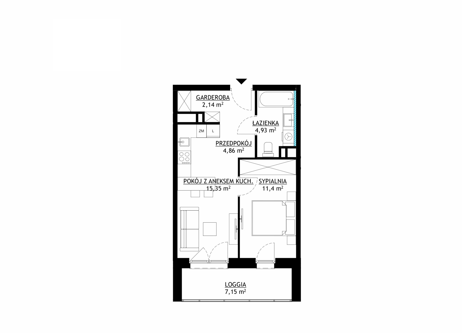 Nowoczesne i kompaktowe mieszkanie o powierzchni 38,68 m² zostało zaprojektowane tak, aby maksymalnie wykorzystać przestrzeń i zapewnić wygodę w codziennym użytkowaniu. W centralnej części znajduje się pokój z aneksem kuchennym o powierzchni 15,35 m², który dzięki dużym przeszkleniom jest jasny i przyjazny w aranżacji. Otwarty układ łączy strefę wypoczynkową, jadalnię oraz praktyczną kuchnię, tworząc spójną i komfortową przestrzeń do życia. Bezpośrednie wyjście na loggię 7,15 m² dodaje prywatną strefę relaksu na świeżym powietrzu — idealną na kawę, rośliny balkonowe lub odpoczynek po pracy.